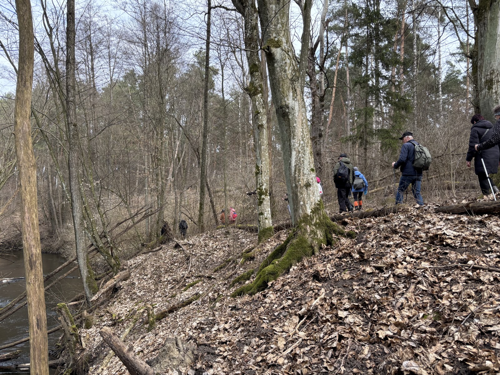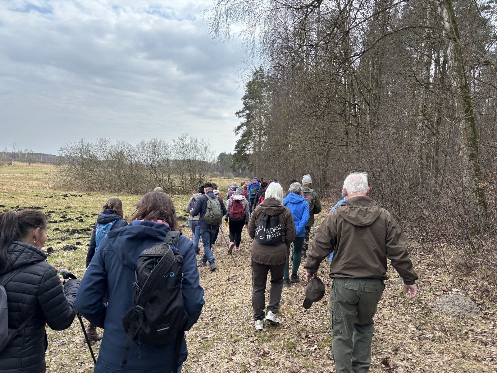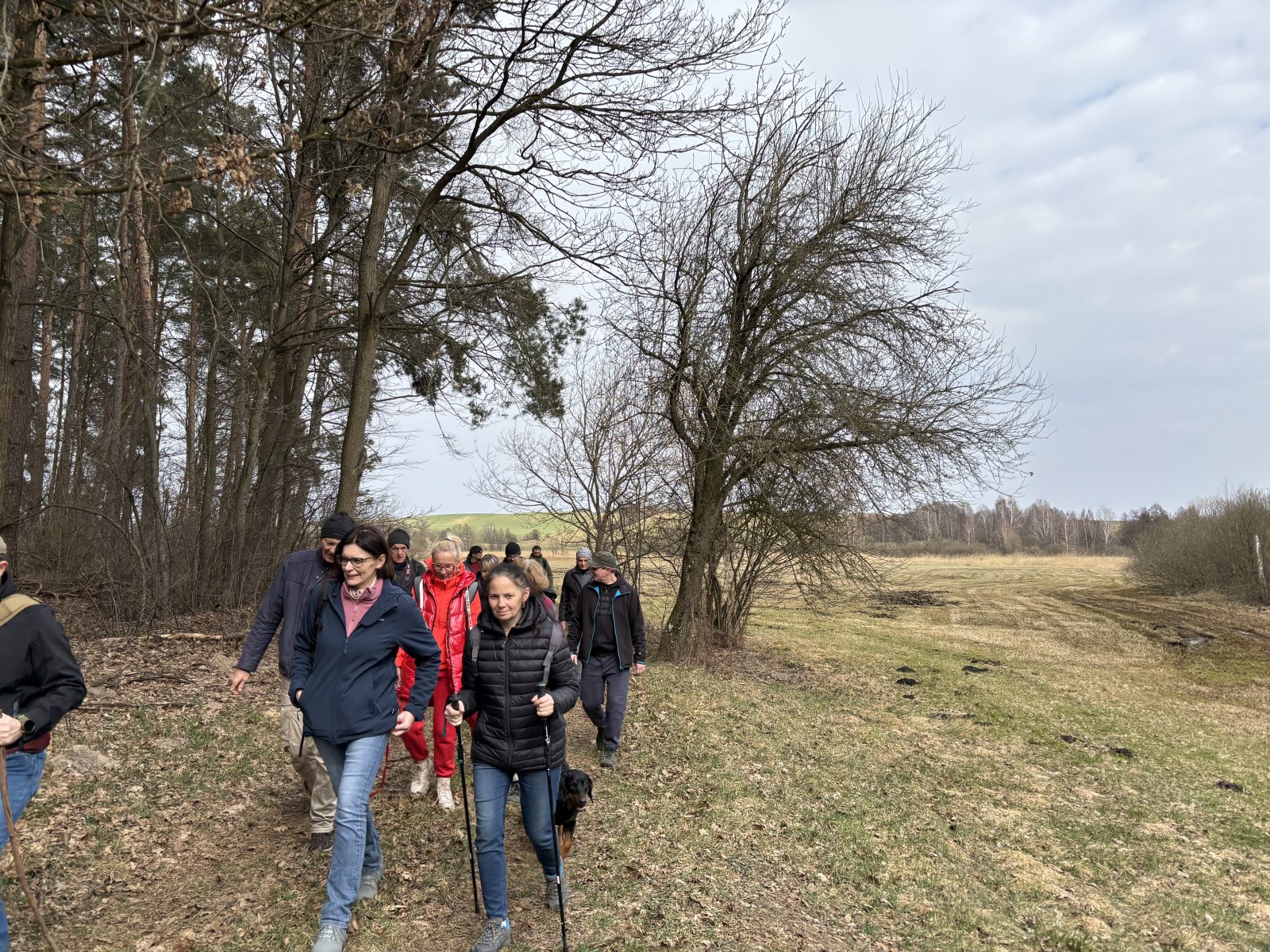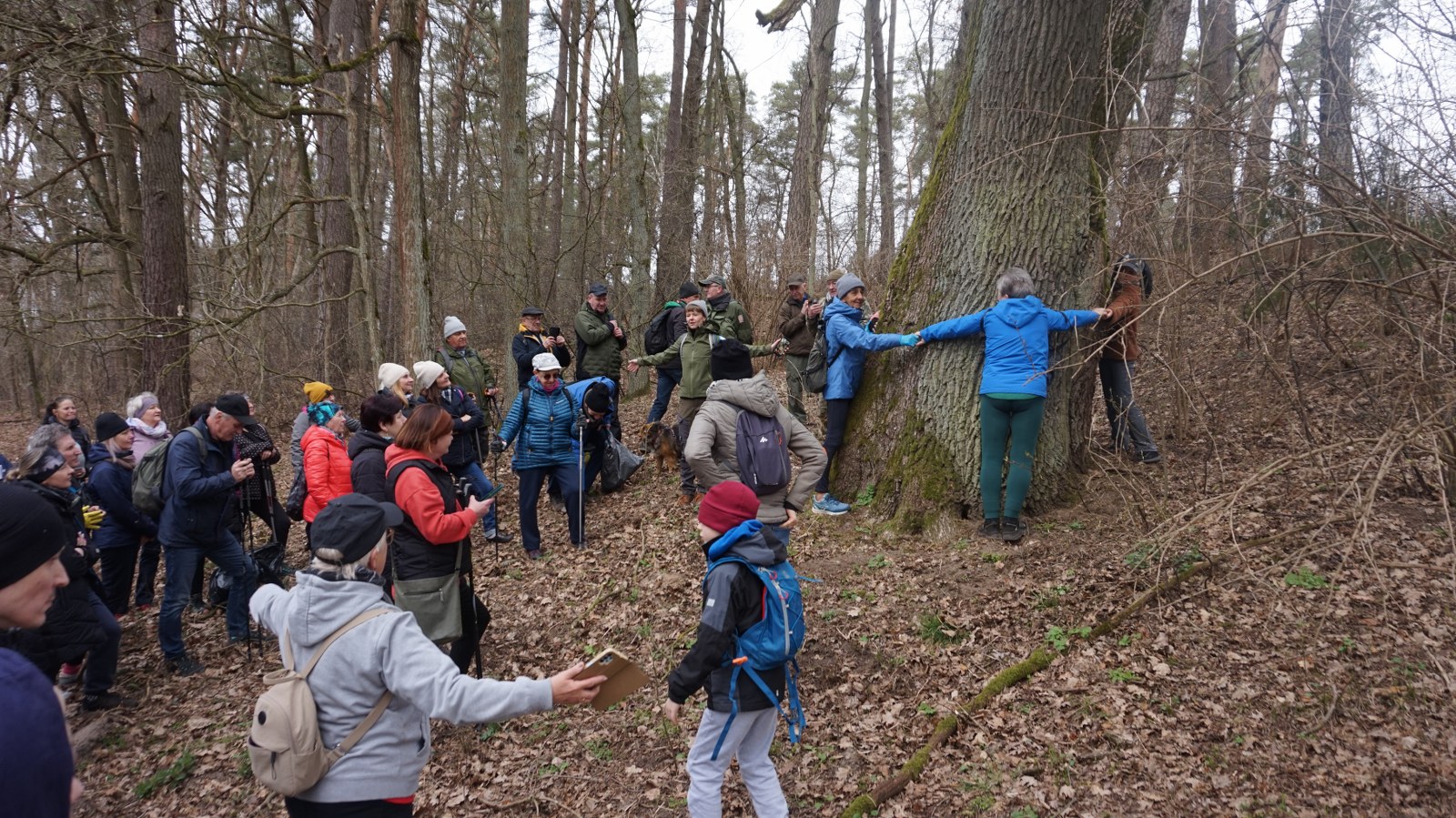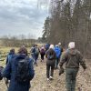 Sporą grupą 55 osób wraz z 4 psami eksplorowaliśmy zakątek naszej otuliny – tzw. Wenecję. Ta lokalna nazwa bardzo dobrze oddaje charakter tego terenu, który z trzech stron jest otoczony wodą. Początkowo szliśmy wzdłuż trzcinowisk i brzegu Jeziora Fabrycznego, gdzie po drodze podziwialiśmy wyjątkowy okaz dębu. Z naszych amatorskich pomiarów wyszło, że drzewo to ma ponad 4 m obwodu.