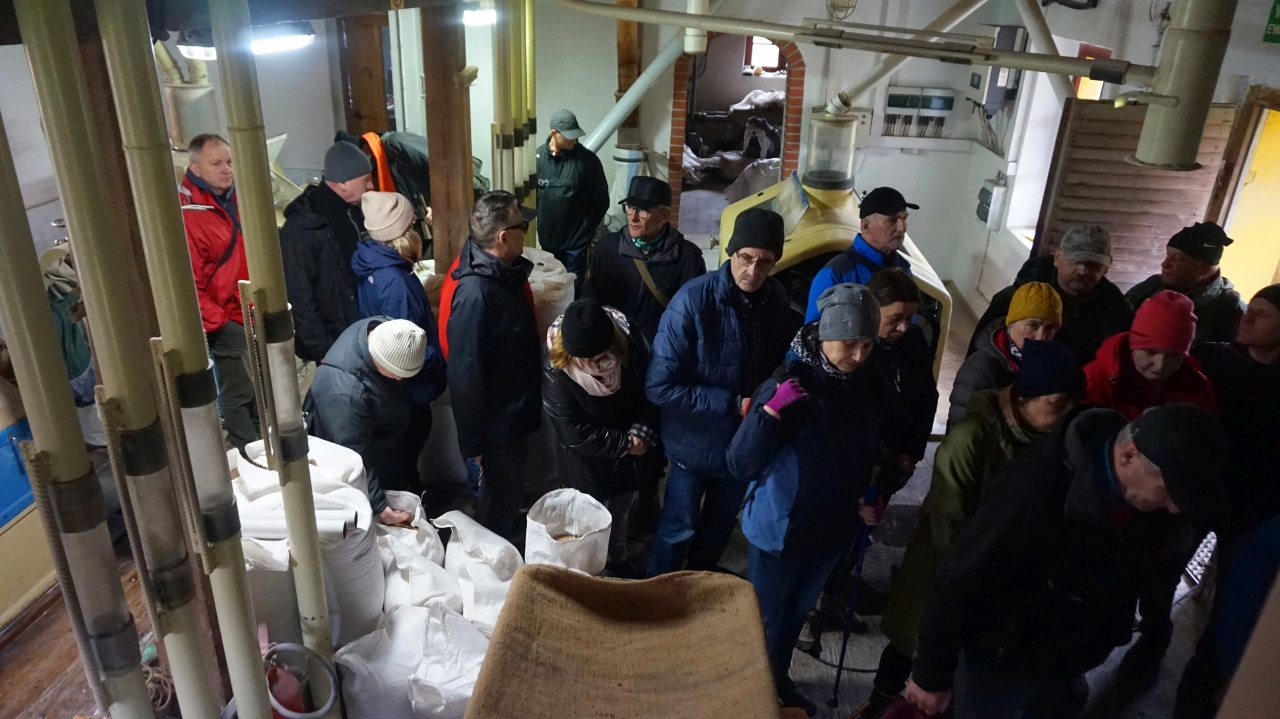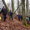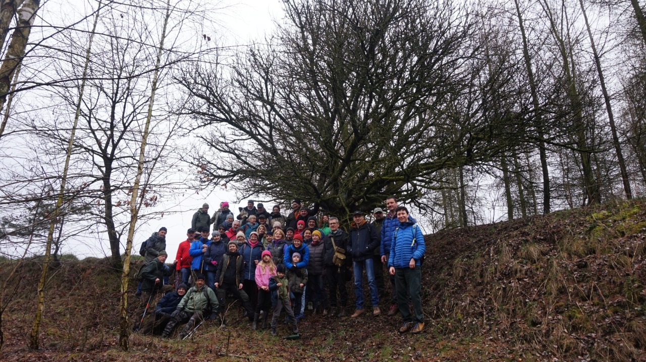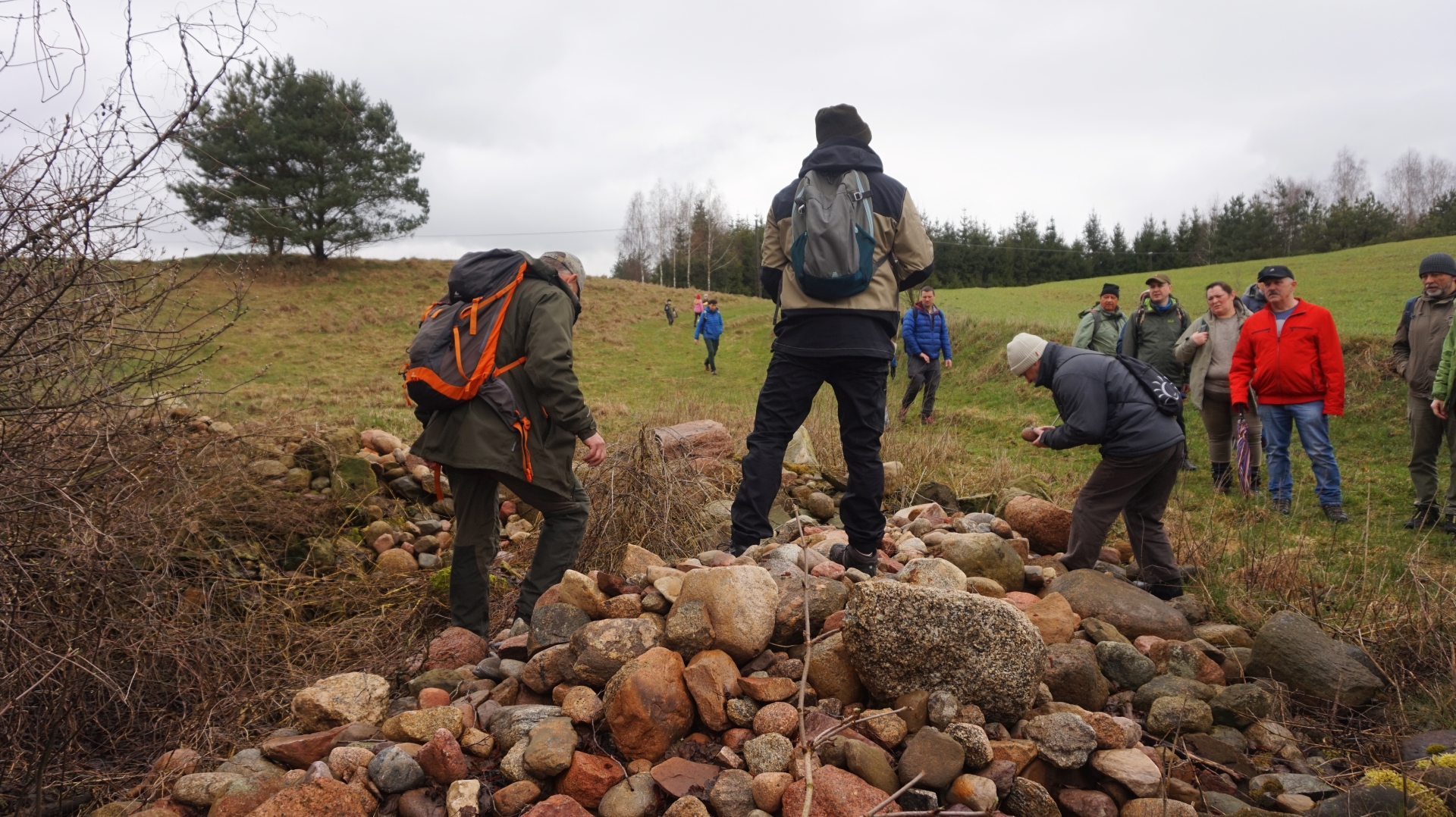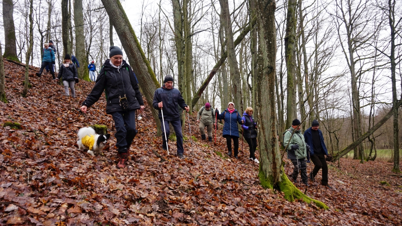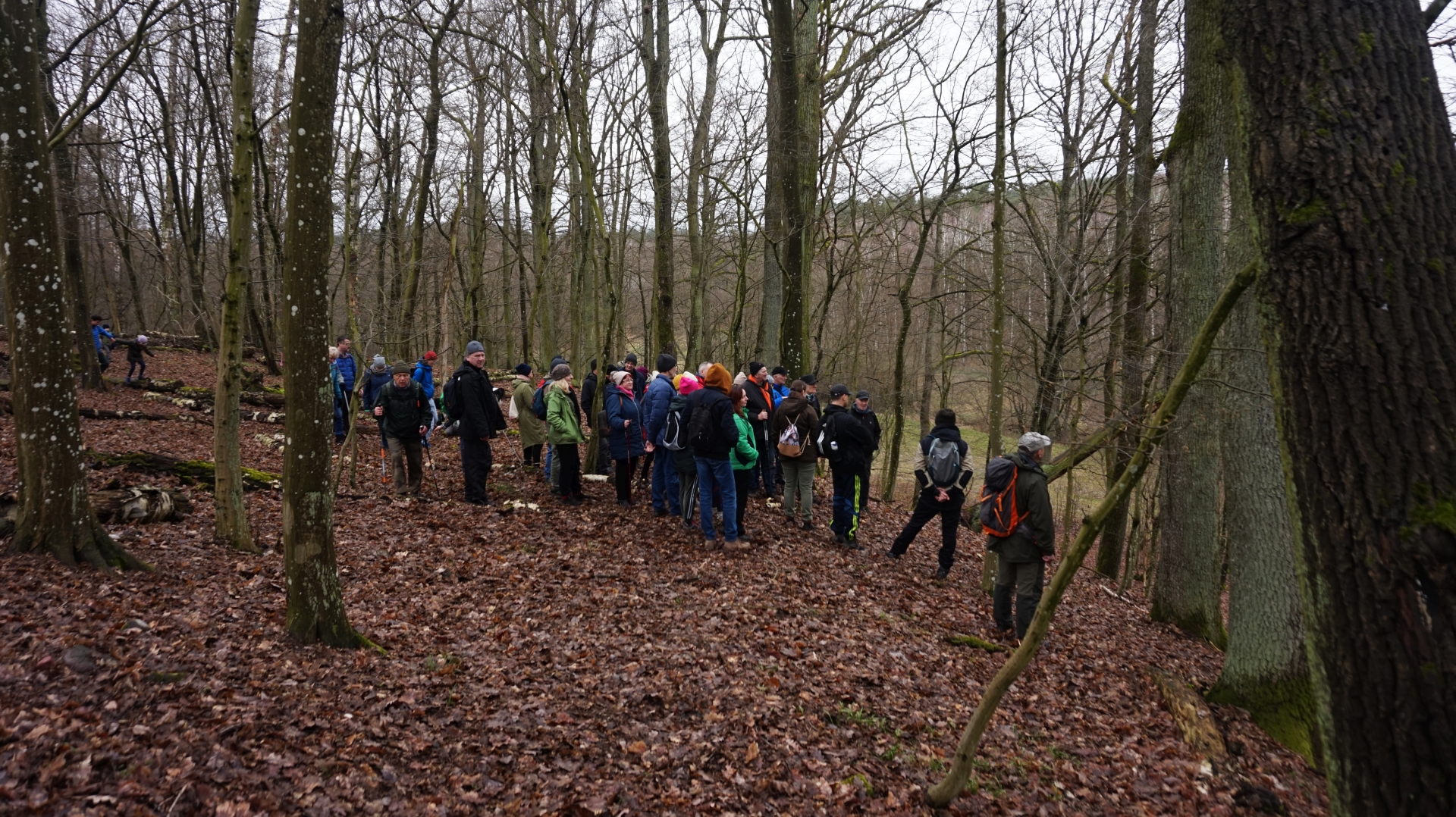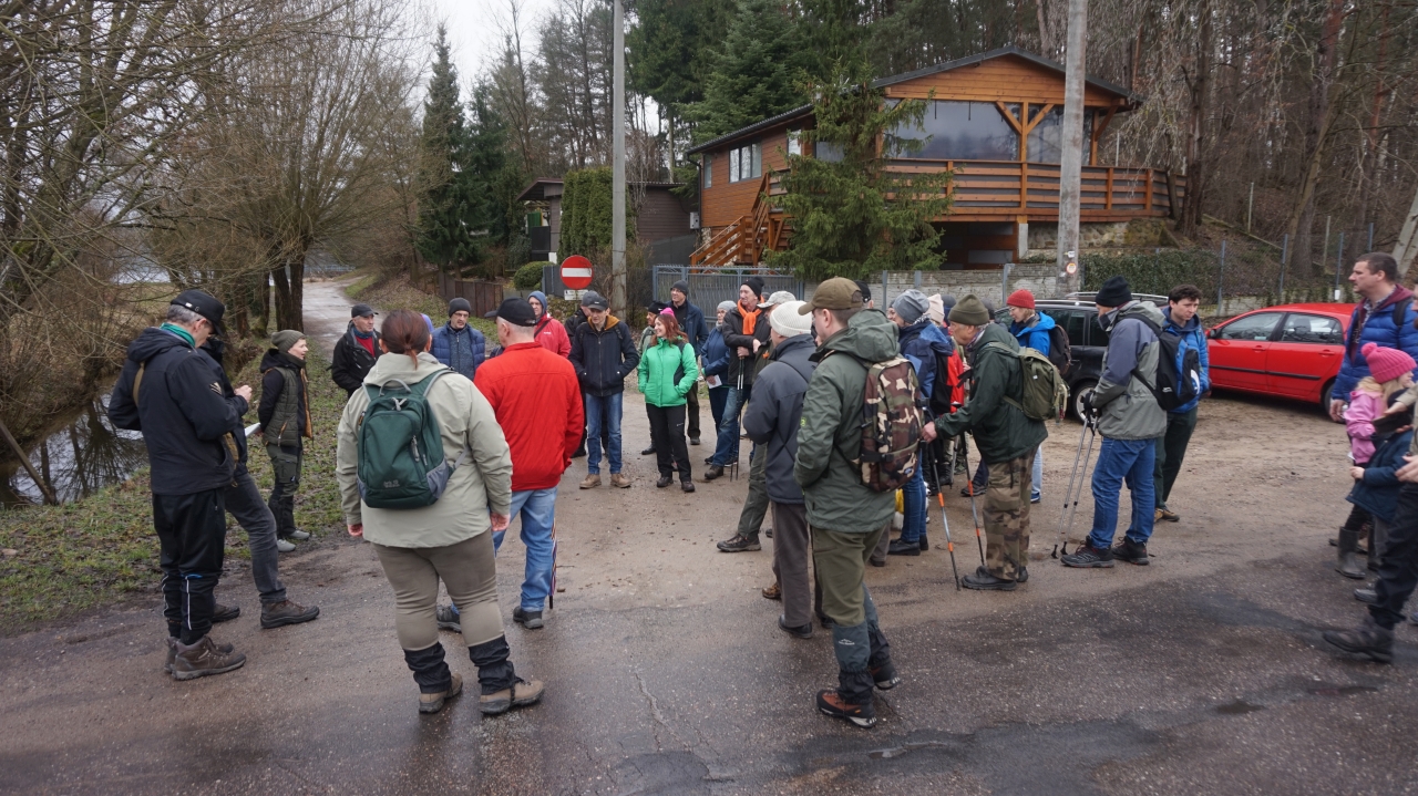 W dżdżysty sobotni poranek 45 osób stawiło się na miejscu zbiórki w Rynku, skąd ruszyliśmy na trasę wzdłuż Rynkówki. Po drodze zobaczyliśmy piękny okaz świerka o wymiarach pomnikowych. Przy bezimiennym cieku porozmawialiśmy o działalności bobrów, ich ochronie i wpływie na retencję wody. Przykład takiej retencji oraz bogactwo przyrodnicze zalewiska bobrowego mogliśmy zobaczyć na własne oczy. Przy typowej dla lokalnego krajobrazu stercie kamieni odpoczęliśmy chwilę i posłuchaliśmy Janka Wiśniewskiego z Towarzystwa Krajoznawczego Krajobraz, który poprosił wędrowców o wkład w rozwój koncepcji zagospodarowania okolic rzeki Wel. Kolejną ciekawostką na trasie była grusza ukryta wśród młodników, która zachwyciła wszystkich swoim pokrojem. Przez większość trasy wspinaliśmy się w górę, pokonując kolejne metry przewyższeń. Gdy dotarliśmy ponownie do skraju doliny Rynkówki, czekało nas dosyć strome zejście w dół przez 120-letnią dąbrowę. Ostatnią atrakcją na trasie była wizyta w Młynie w Rynku, gdzie młynarz oprowadził nas po budynku, opowiedział o swojej pracy i historii tego miejsca. Serdecznie dziękujemy Panu Przyborowskiemu za poświęcony czas.